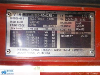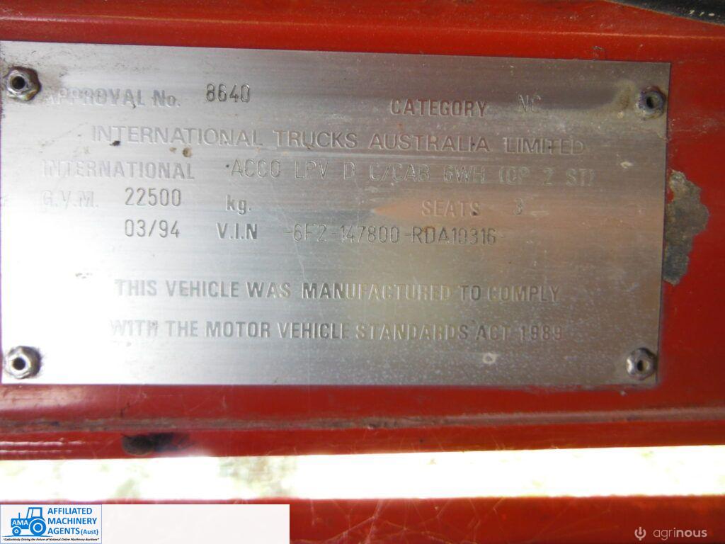 1994 International Acco T1850E Tray Truck ~ 22.5t GVM ~ Starts runs drives and stops ~ Lazy axle ~ Long 8.4mtr tray ~ Speedo reading 447,725 Kms ~ Clean tidy truck, Ex Aust post ~ unused for some time ~ Un-reg, no RWC