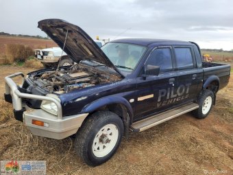 2005 Blue Triton 4x4 Dual Cab Ute ~ 4cyl 2.8 diesel ~ 5sp manual ~ 274,066 Kms ~ Alloy bullbar with driving lights ~ Wired for dual battery system ~ Sunraysia rims ~ Tyres approx 25% ~ Under bonnet compressor ~ Long range fuel tank in tub ~ Starts, runs & drives ~ Clutch, brakes & lights work ~ Ideal farm workhorse.