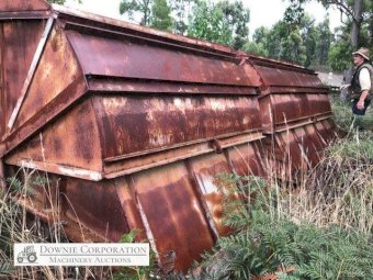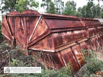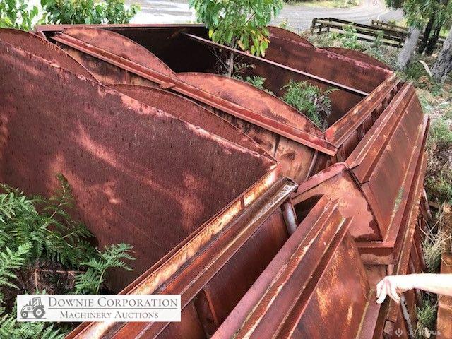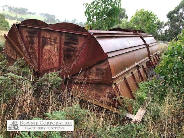2x H/Duty Steel Dumping Hoppers on solid steel frame 4m x 8m, has twin canter lever "Clam Shell" opening doors (photos show it up-side down). Previously designed & purpose built for woodchip storage & quick dump into semi-trailer/truck. This item has never been used, it could be set-up for bulk firewood, sawdust or woodchips from a sawmill.