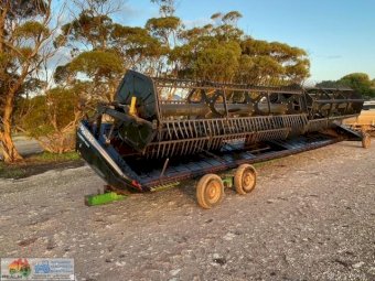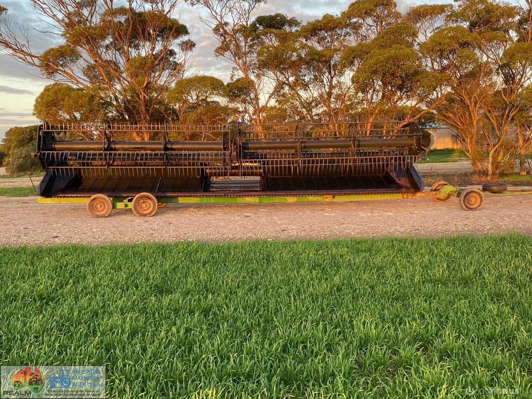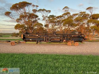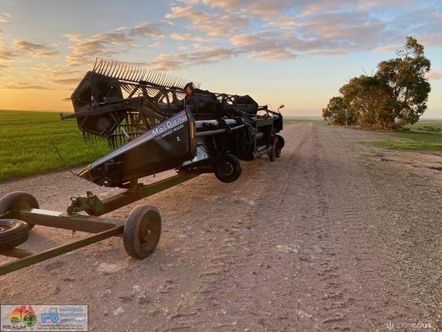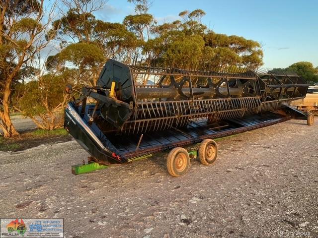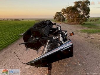 Macdon Header Front on Comb Trailer ~ 30ft 972 macdon , double drive knife, movable decks for windrowing , done 600ha on extensive pre season at local macdon dealer , comes with a box of spares. Good overall condition