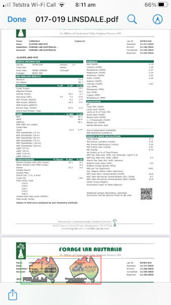 42 x Big Squares (8x4x3) of Clover & Rye Hay ~ Good quality shedded ~ 19.2% Protein ~ Feed test attached ~ Bid price is per bale (Ave 583 Kgs) ~ Loader available