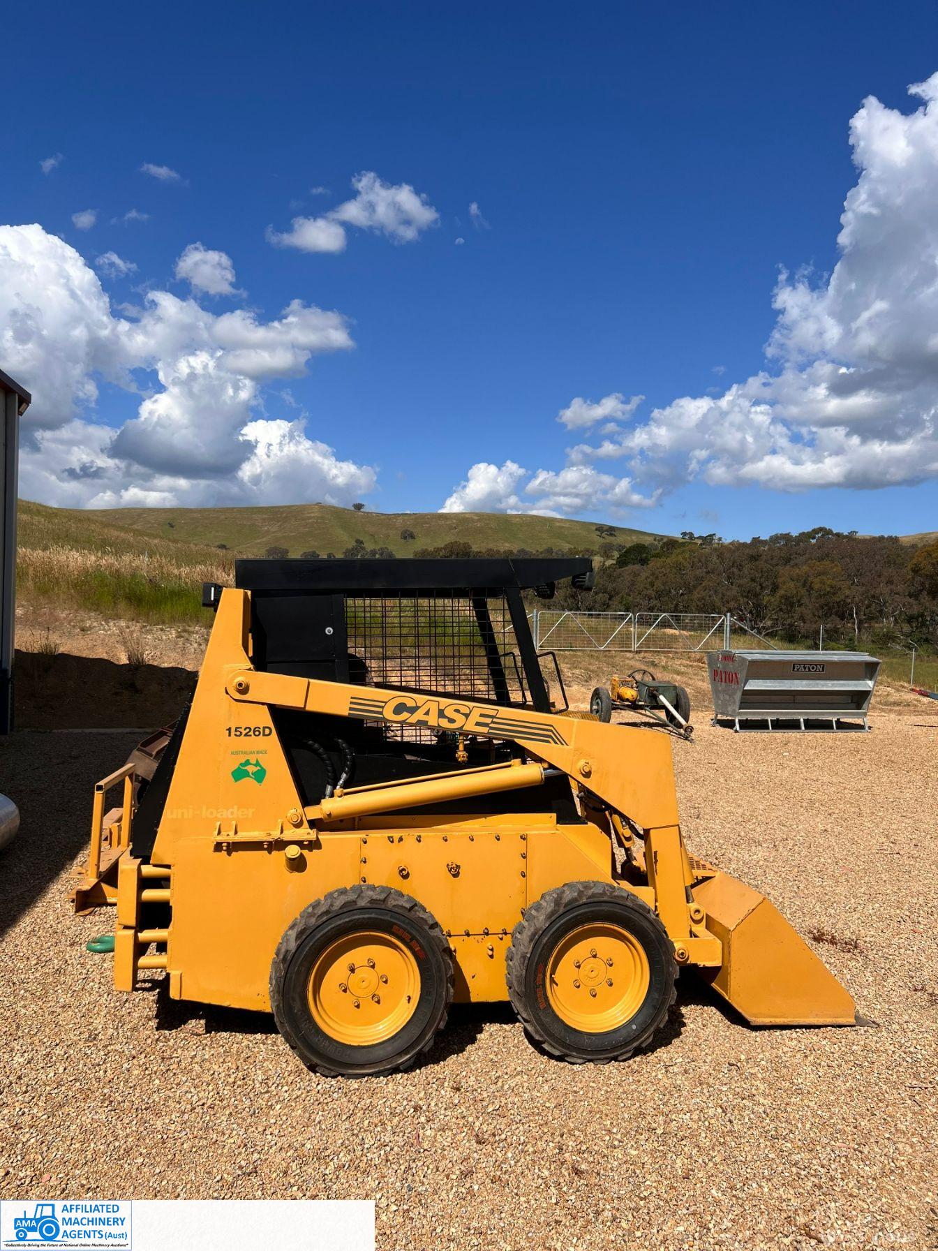 Case 1526 Skid Steer ~ Mid 1970’s ~ Re-Hosed ~ Re-Wired ~ New Tyres ~ Starts & runs well ~ Suit Farm use ~ Comes with pin on attachments
