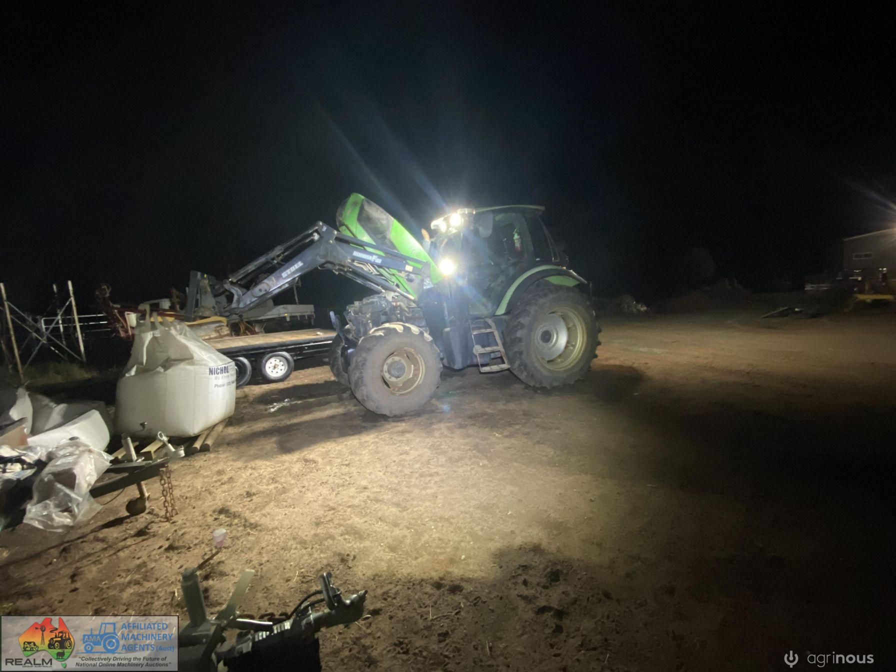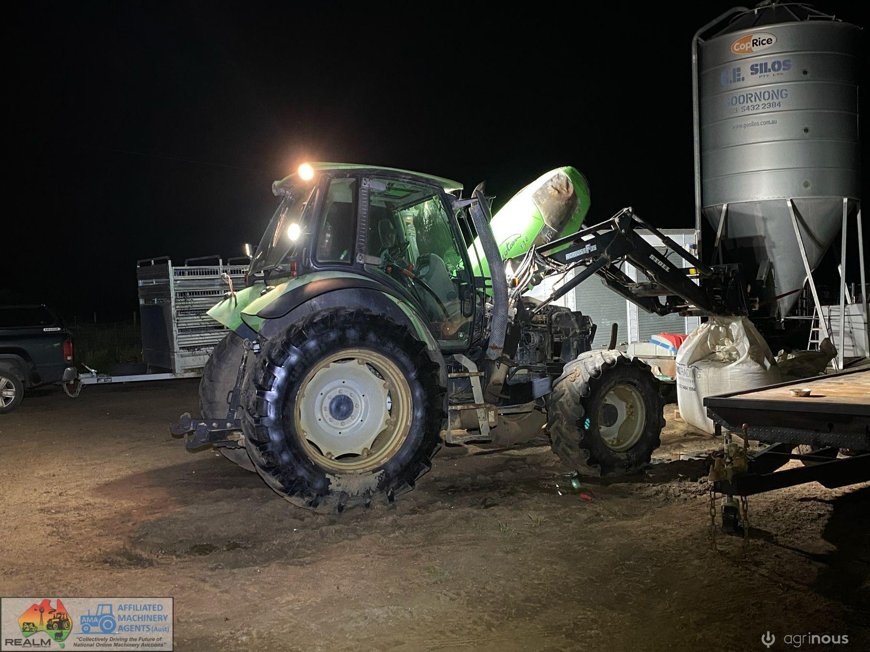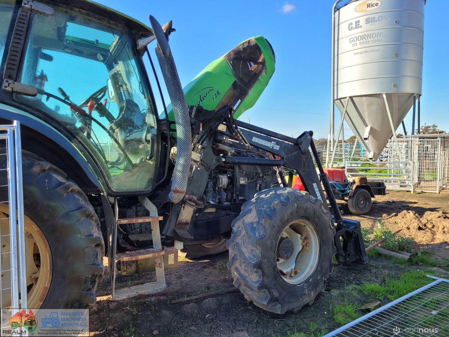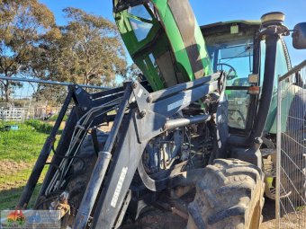Deutz Agrotron 128Hp Tractor with Robust F35 level lift FEL ~ 6cyl Turbo diesel ~ 9,400 Hrs ~ Shuttle shift ~ Hay forks & 6ft bucket ~ Dual remotes, 3pl, 2sp PTO ~ Tyres R=75%, F=15% ~ Engine starts & runs well ~ New starter mtr & alternator fitted & now computer is showing Error #N91 (Faulty Creeper Mode), needs attention from qualified Deutz Dealer (possibly a faulty sensor) ~ NB: Tractor won't drive, but was working fine before fault ~ Suit repair or wrecking.