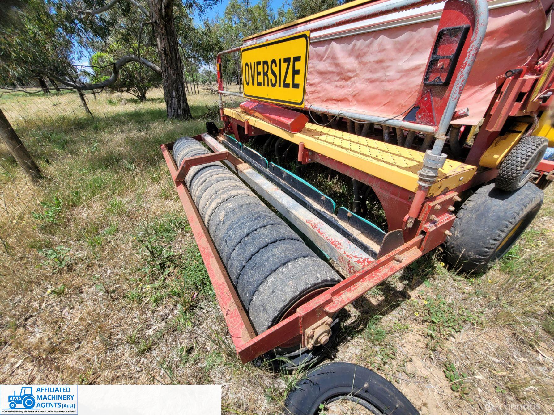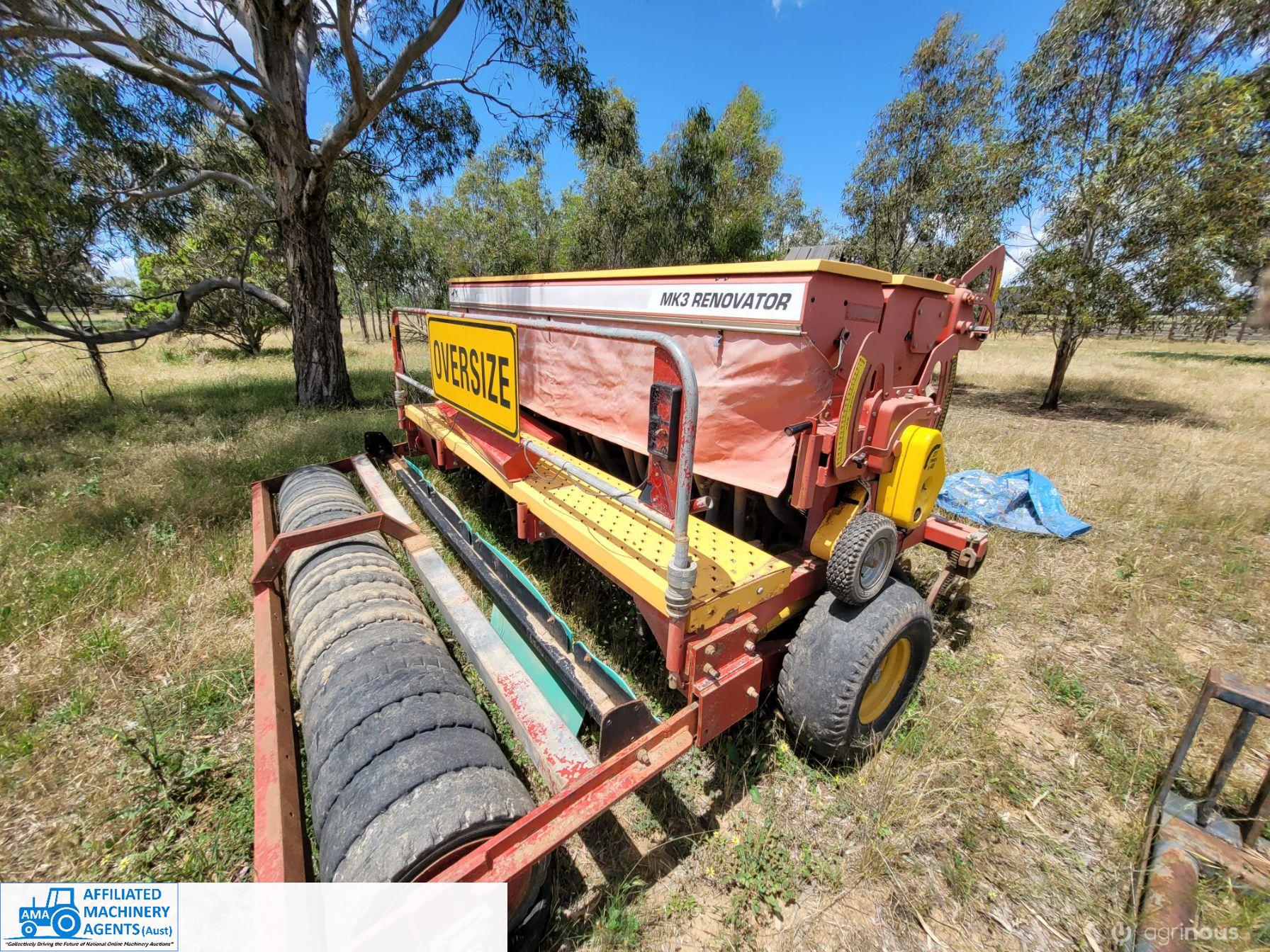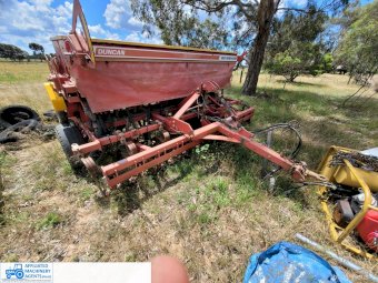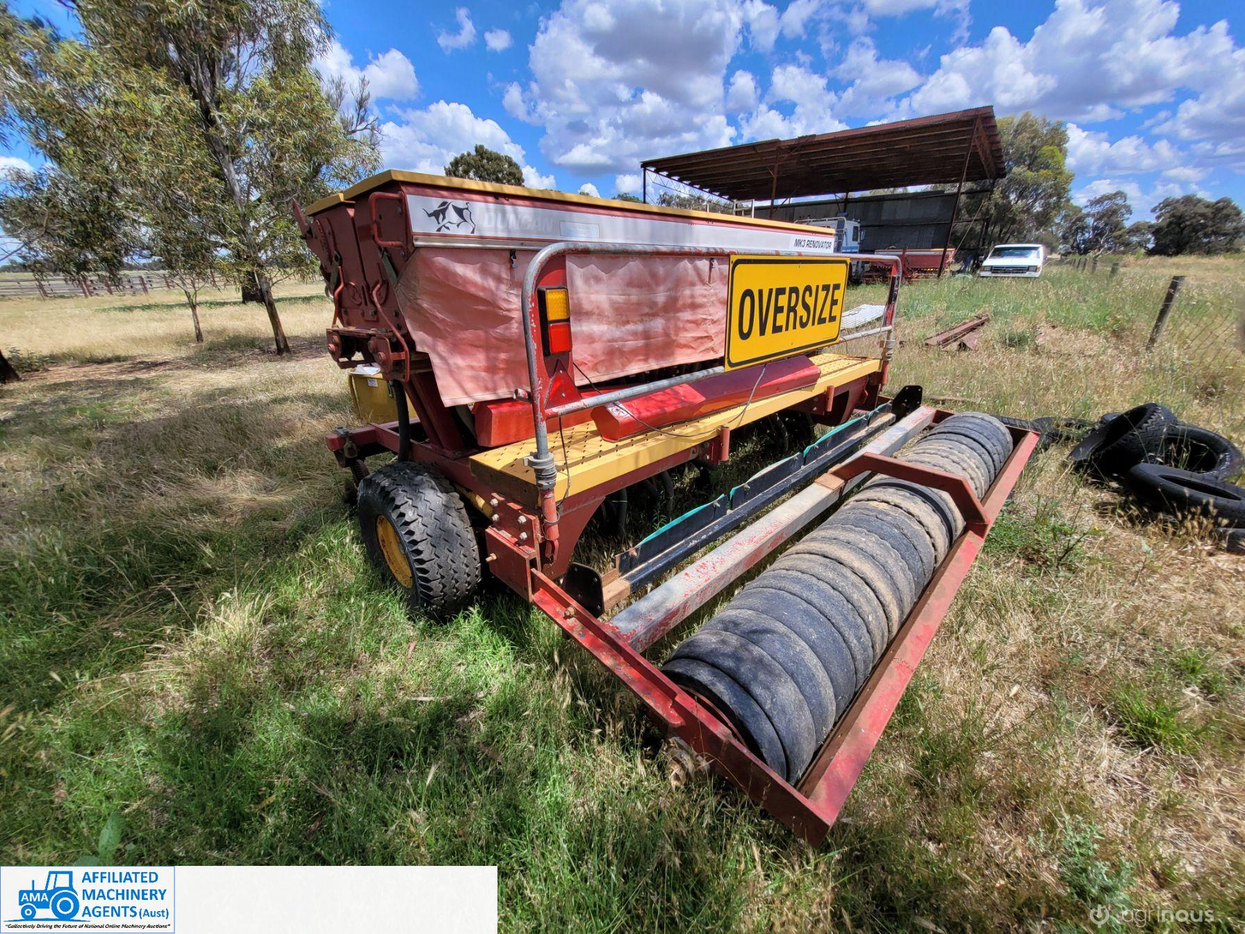 Duncan 23 run Mk3 seeder/renovator. Seed and frt boxes Plus separate small seed box and one set of new coulters supplied (not fitted)original tyres. Solid rubber tyred roller. Paddock ready.