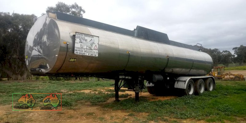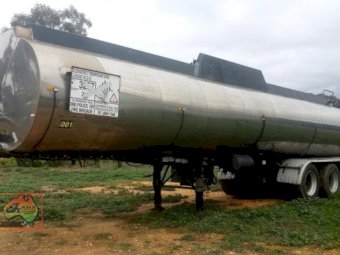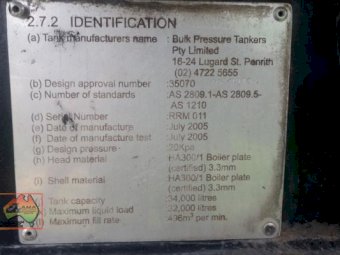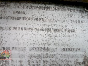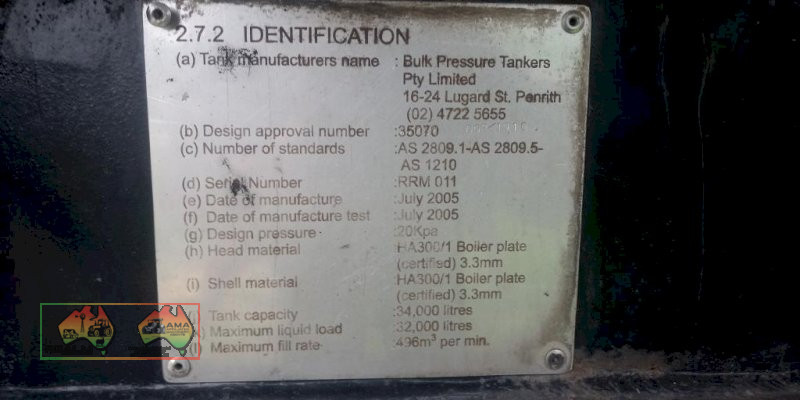 Bulk pressure tanker, series AT. Emulsion tank, triaxle, air bag, alloys. Liquid load 32000, tank capacity 34000 Date tested June 2015. To be redone 2017. Unused for several year. CP 08/05 Vin:6B9BBBBP52AD8035 atm 39000KG Alloy tank with stainless steel lagging. Clean and straight tidy trailer