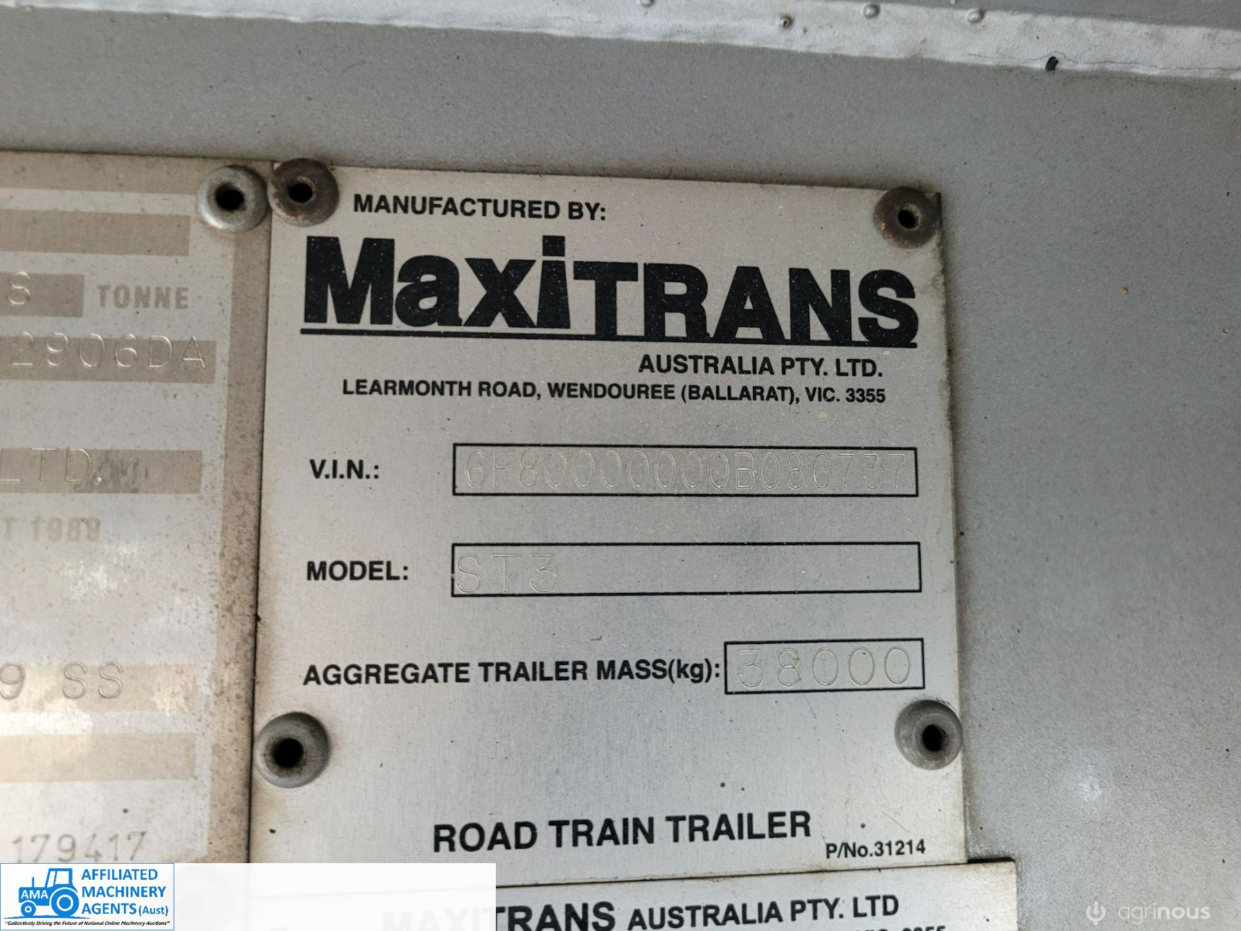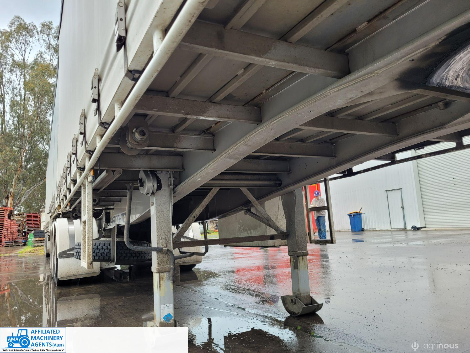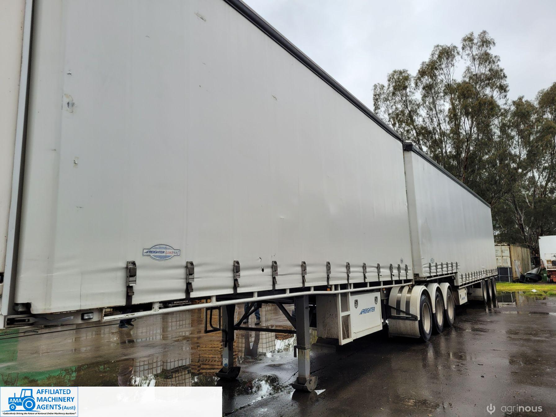 Freighter Maxi-Trans B-Double Tautliner A&B Trailers 5/13 built, one owner. 16 ply R168 radials on alloy rims. A trailer 7.5m (12 pallet) - B trailer 13.7m (22 pallet) - Overall length 21.55m. Good quality side curtains & floor. 2 spare wheels, tool boxes, good tyres. Current Vic rego (A = 4/11/22 & B = 28/12/22). Currently in use, should pass Roadworthy Inspection (Sold without RWC) - These 2 combination trailers would Suit New Buyer.