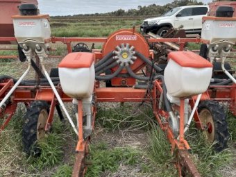 Gaspardo 8 metre 8 box large seed planter. Suit cotton etc. Needs some rubber piping and plastics . The bones are all there . For more information call me Dale McCleary on 0474 230 633 0r 1300 GO SELL . Located Griffith NSW.