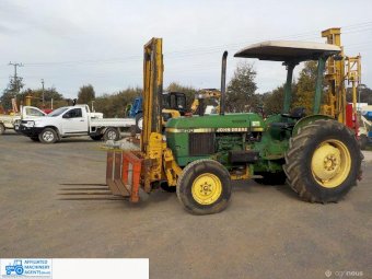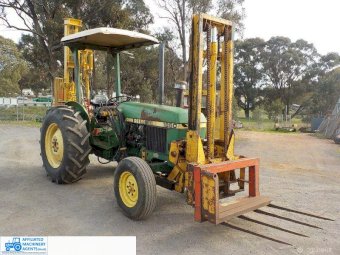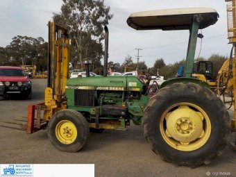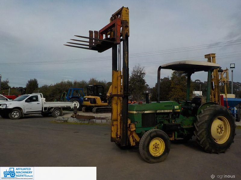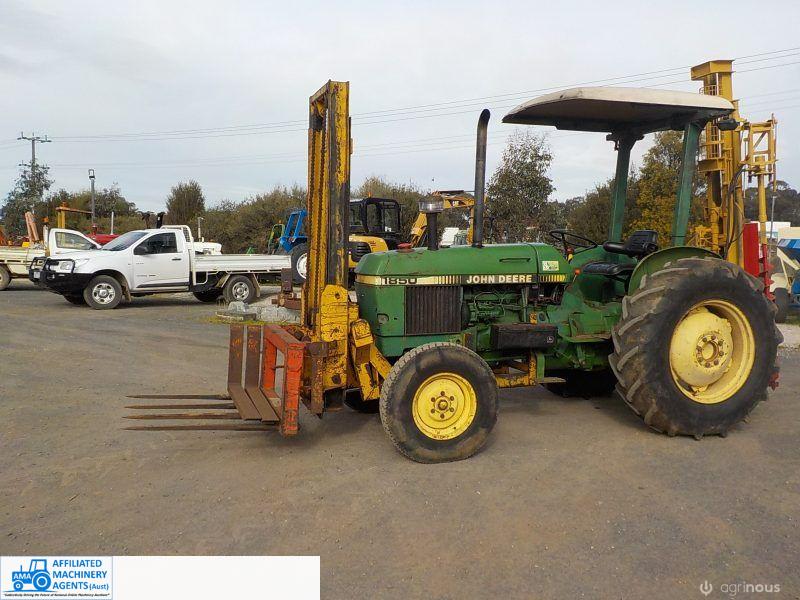 John Deere 1850 with front fork attachment that has side shift, Folk lift goes to 2900, Has fork tynes & hay forks, Good tyres, 55HP, 3PL, PTO,