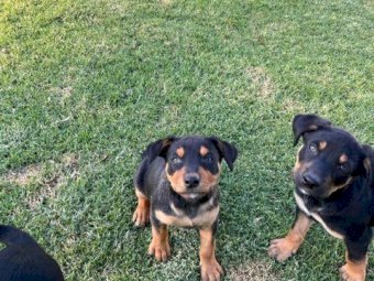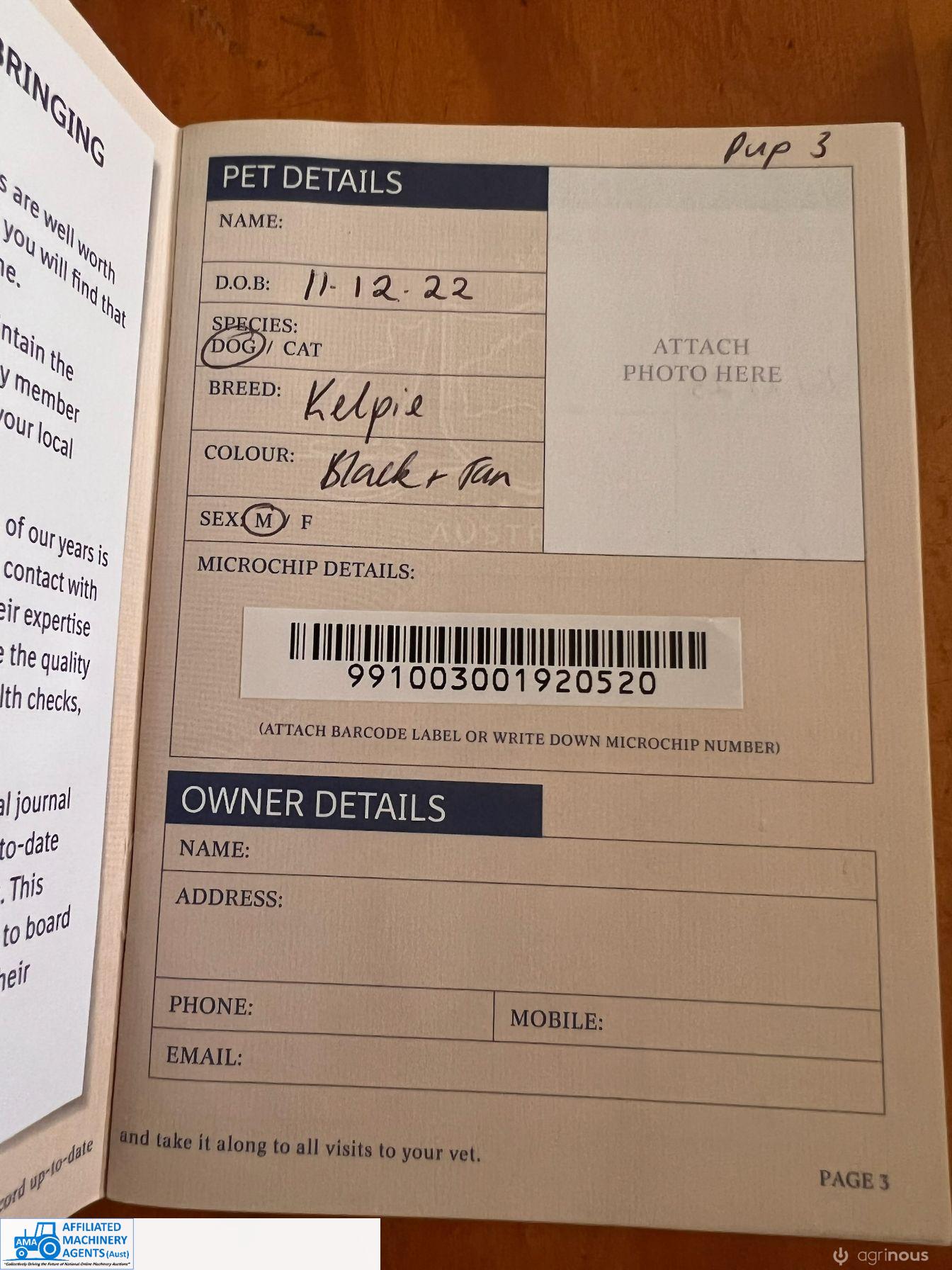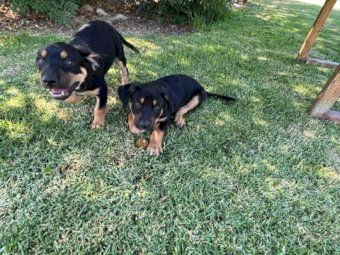 Male Black & Tan Pure Bred Kelpie Pup ~ 10 wks old (11/12/22) ~ Fully vaccinated, Vet checked, Micro-chipped & ready to train ~ Bitch is Pure Cream Kelpie ~ Dog is Red & Tan Kelpie ~ Both parents work cattle on a regular basis and the Bitch also works sheep well. (We don’t have sheep) ~ Our bitch and all puppies are well socialised with kids and other dogs ~ Attached pic of Microchip numbers and our source number ~ Also video of dog, bitch and puppies working stock ~ NB: These are Pure Bred Working Dogs, which need plenty of space & activity ~ They are not to be sold for suburban pets.