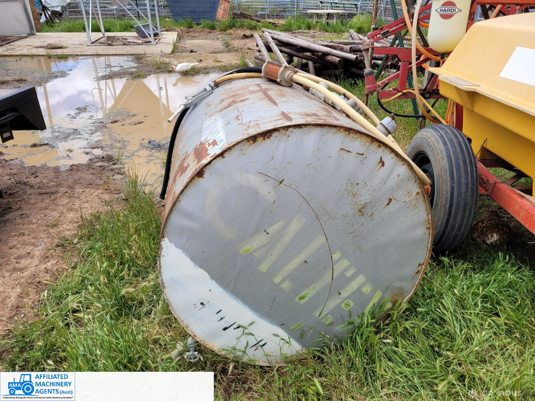 Rare Twin Fuel Bowser; 2 fully sealed separate 700 Ltr compartments, each with their own separate filler, drain & hose outlet. Designed for ULP & Diesel, comes with overhead stand. Good condition.