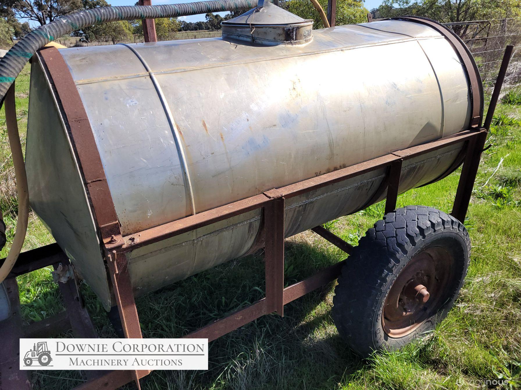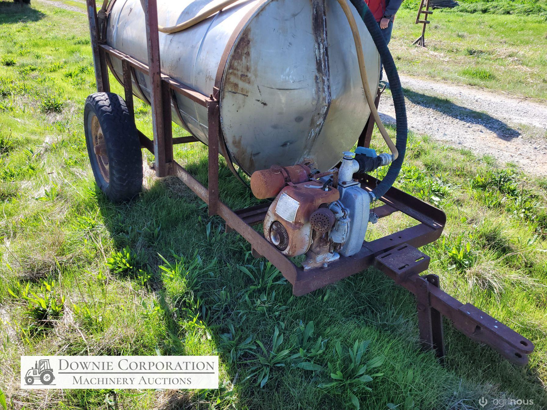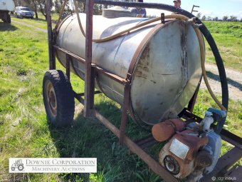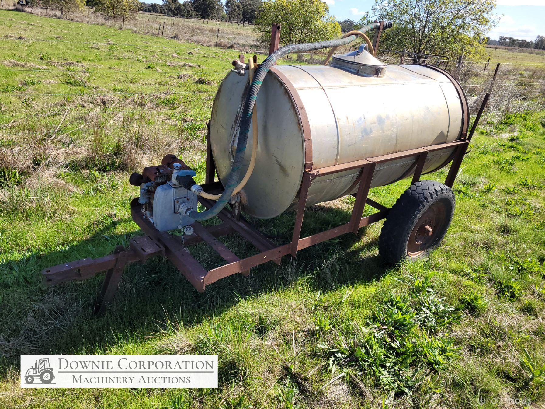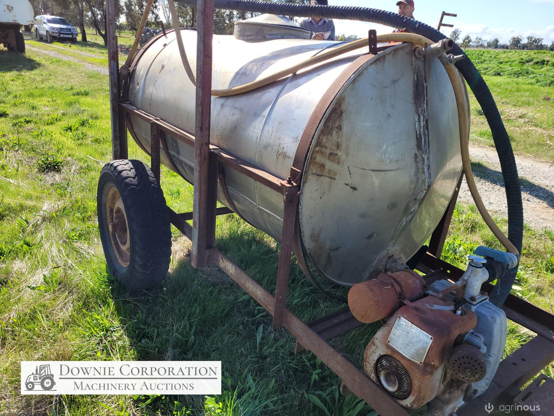Stainless 1,000 Ltr Water Tank on single axle trailer/frame; no leaks; Villiers motor on pump currently not going; suction & fire fighter hoses included.