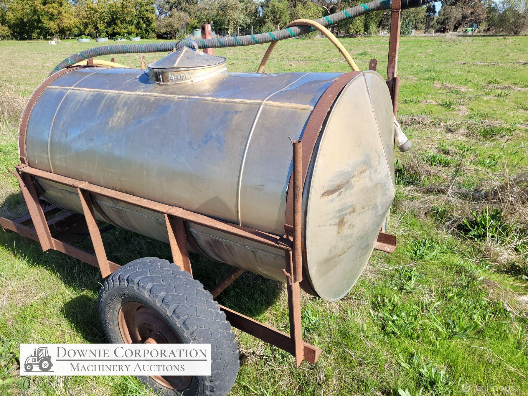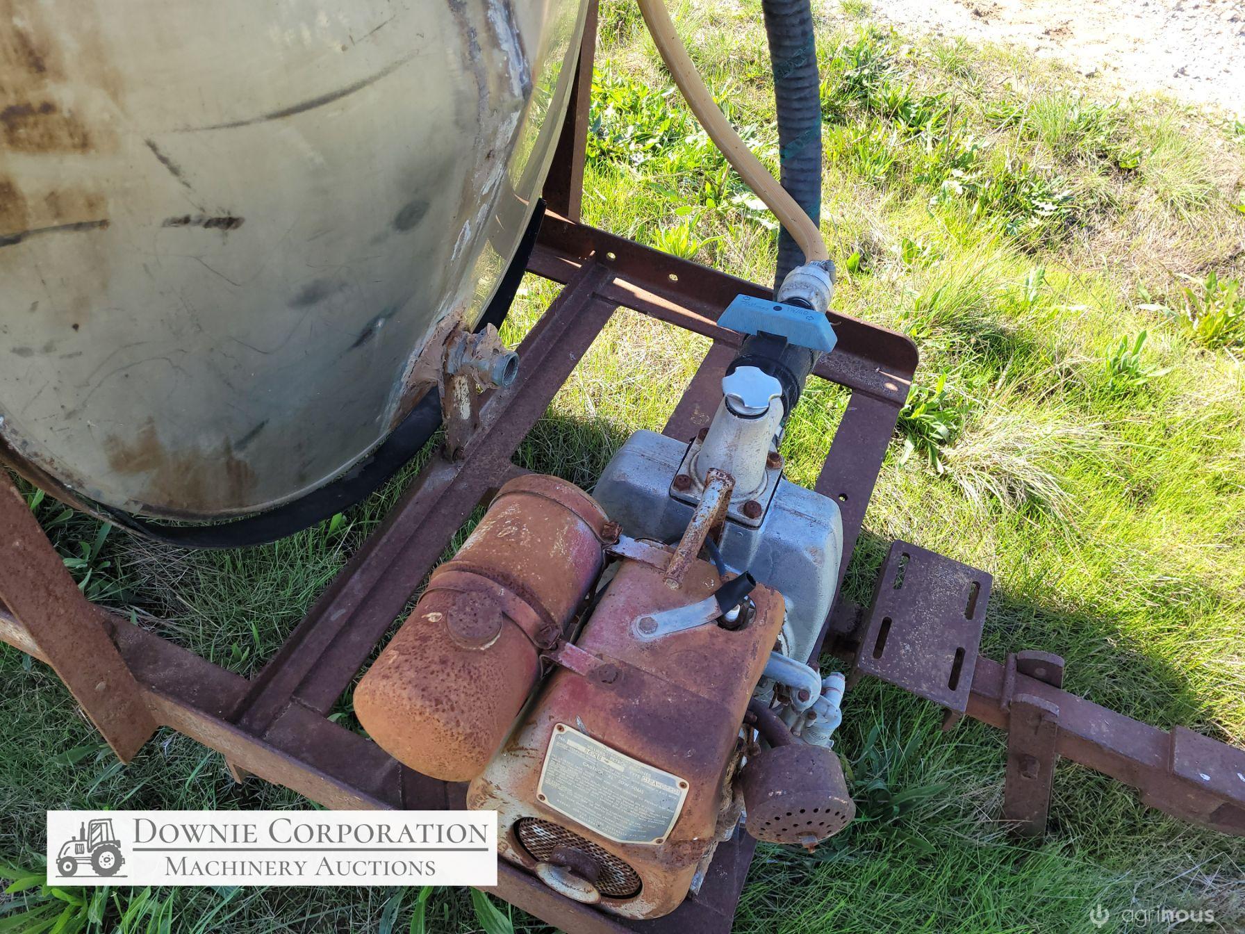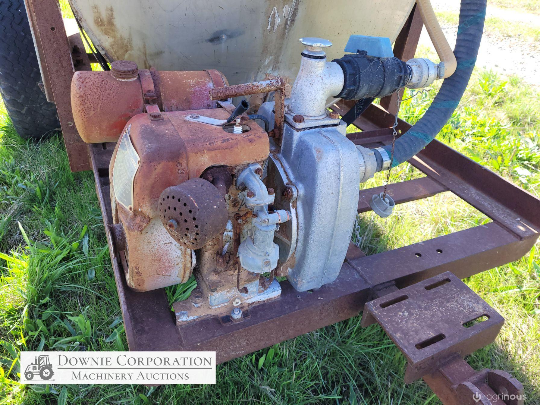 Stainless 1,000 Ltr Water Tank on single axle trailer/frame; no leaks; Villiers motor on pump currently not going; suction & fire fighter hoses included.