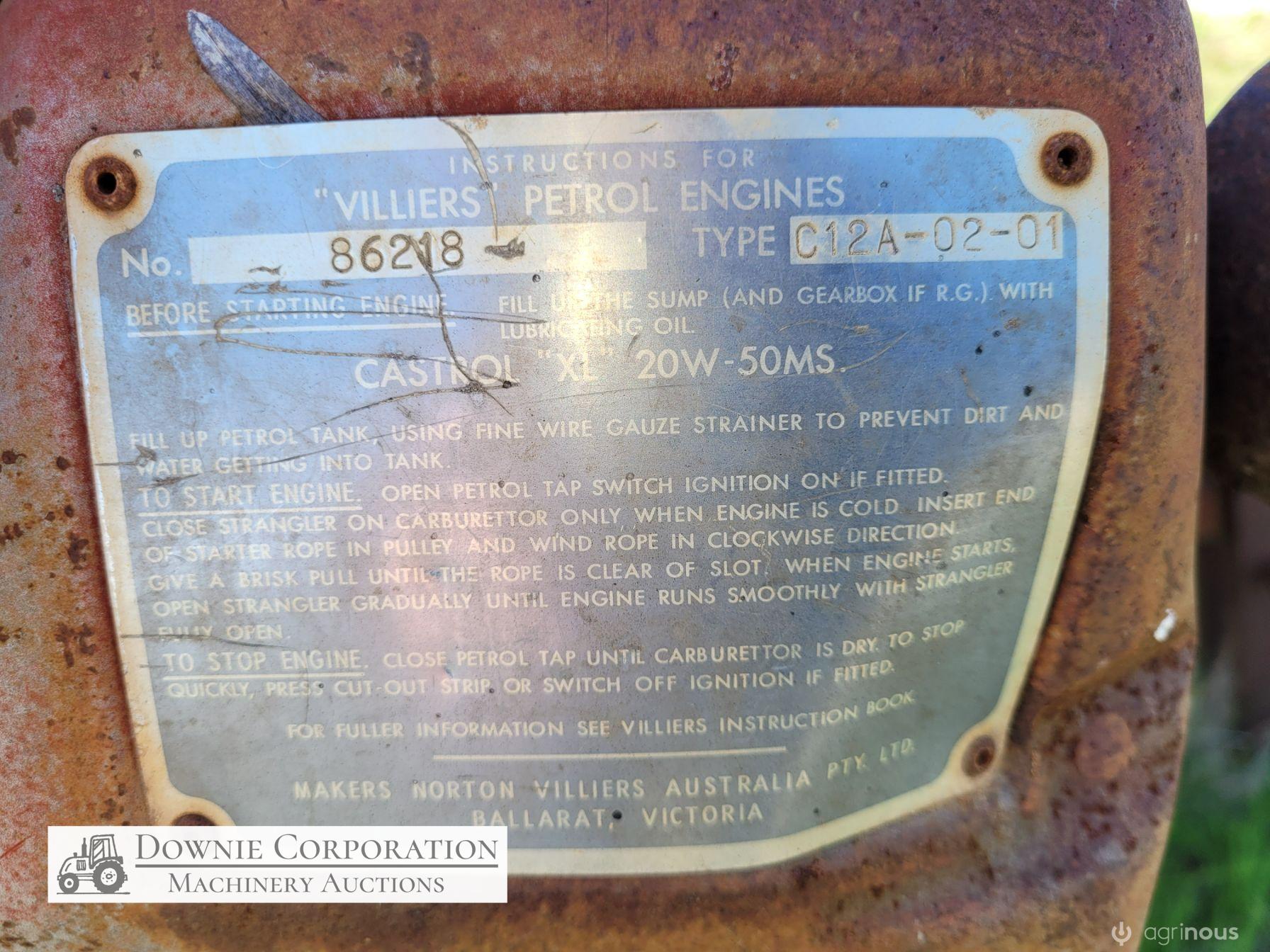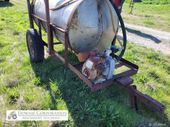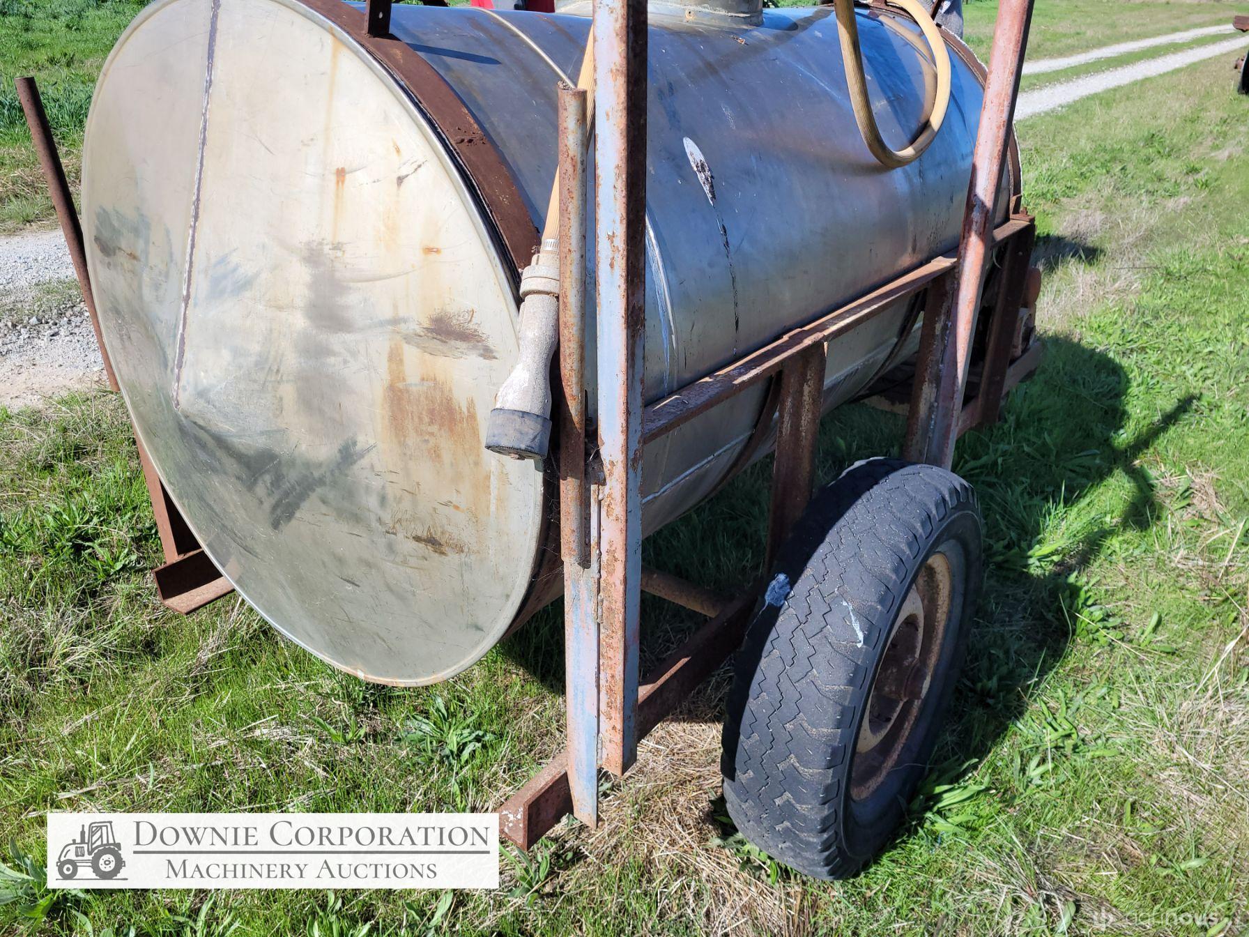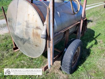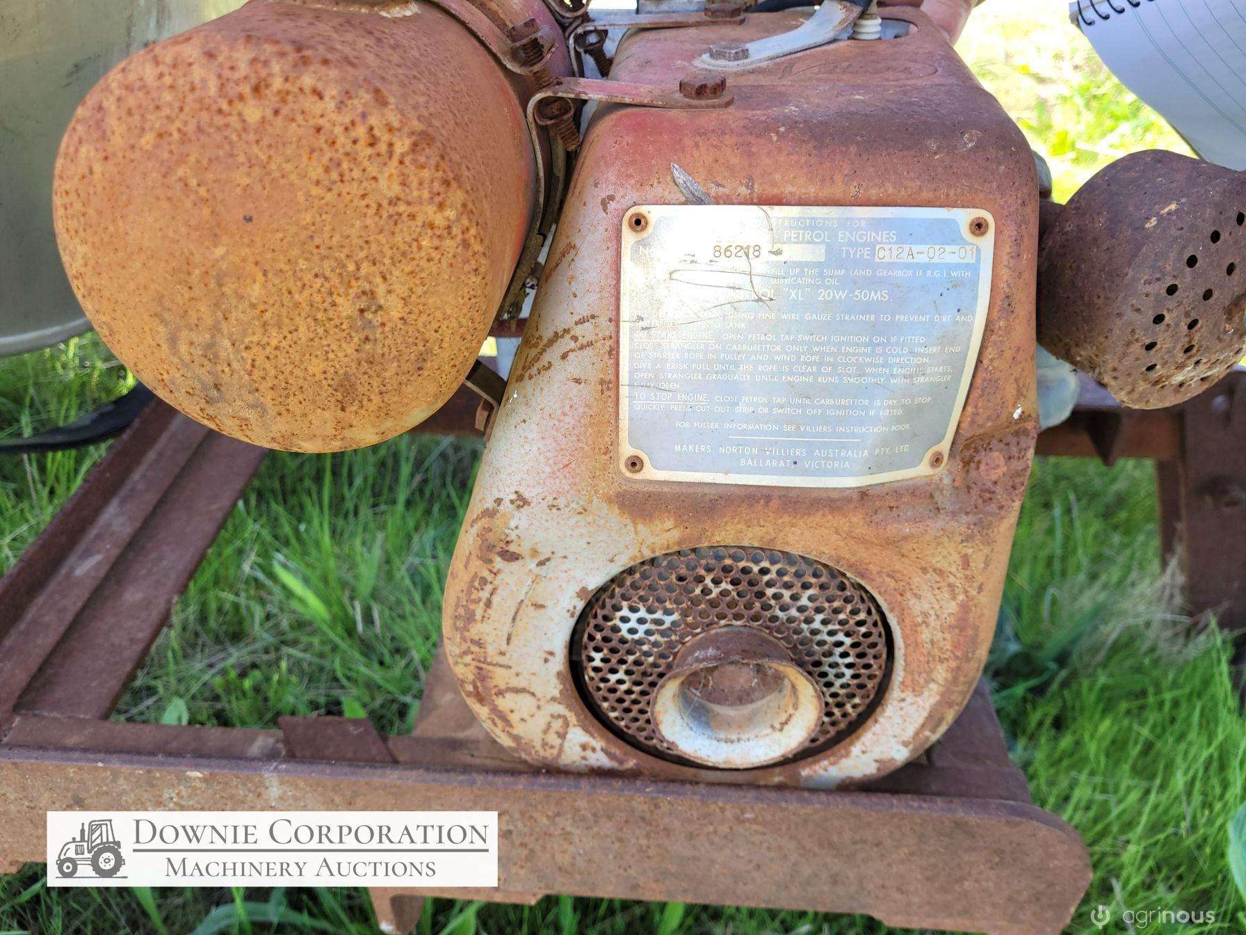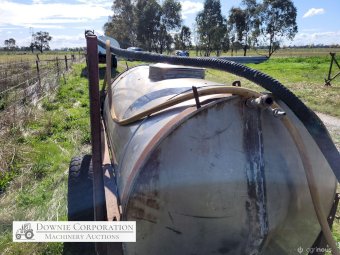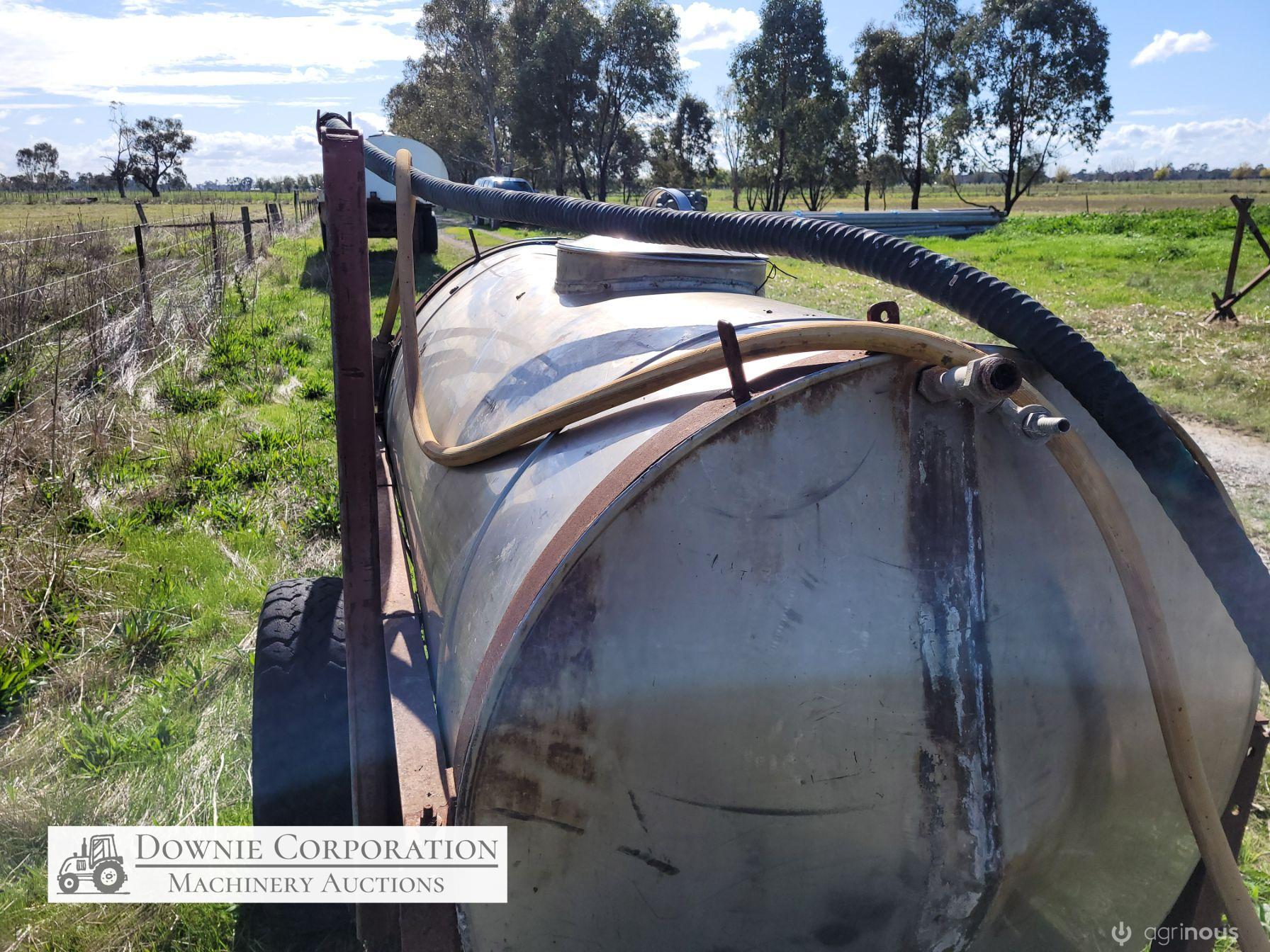 Stainless 1,000 Ltr Water Tank on single axle trailer/frame; no leaks; Villiers motor on pump currently not going; suction & fire fighter hoses included.