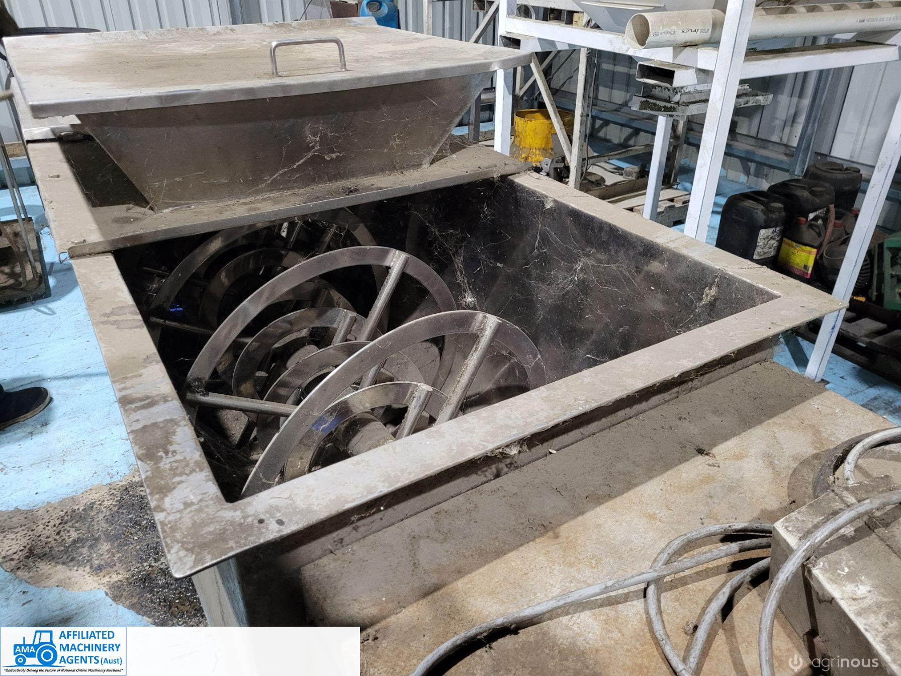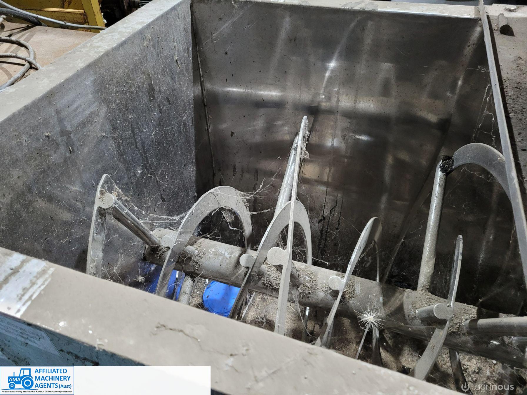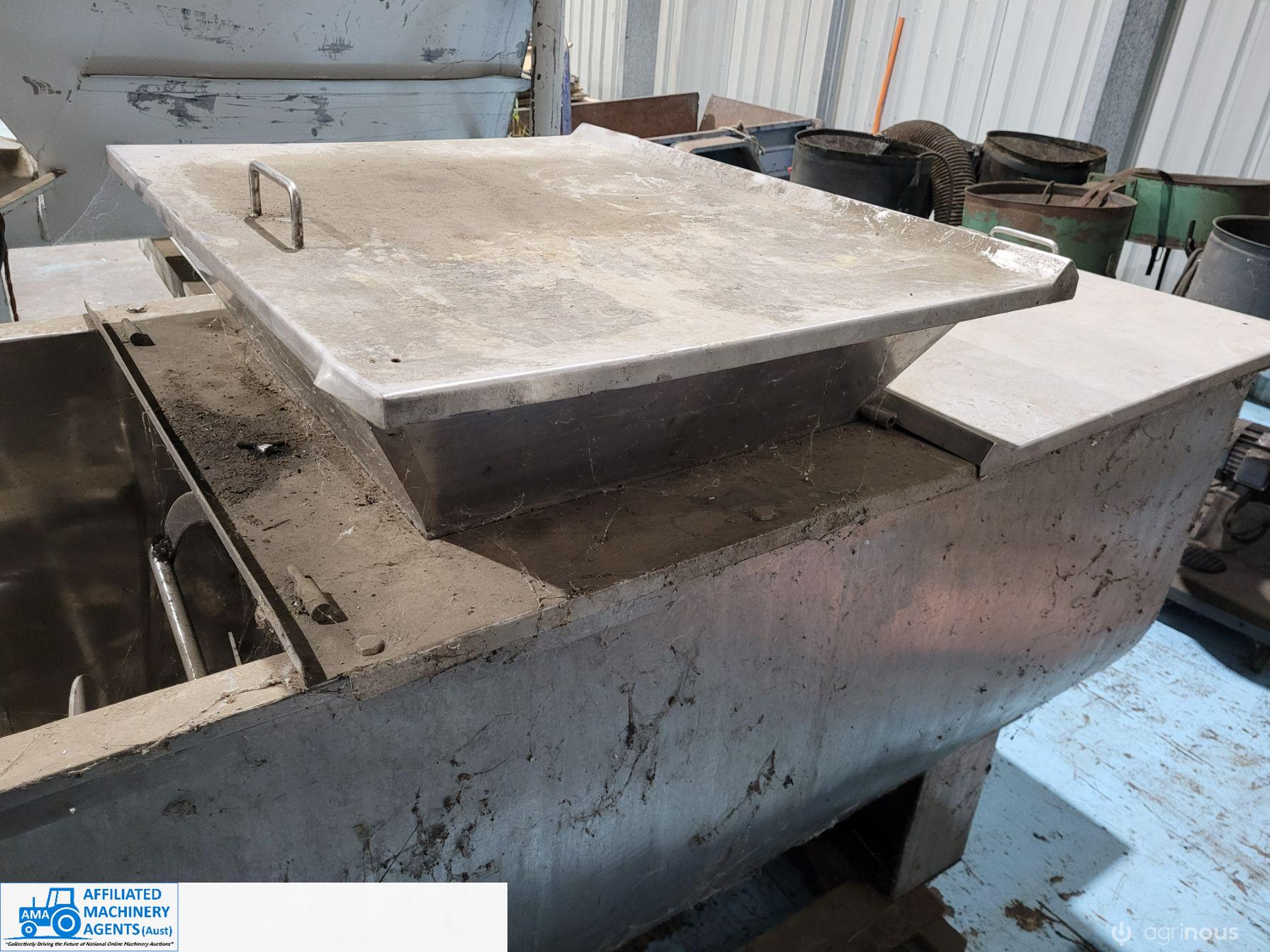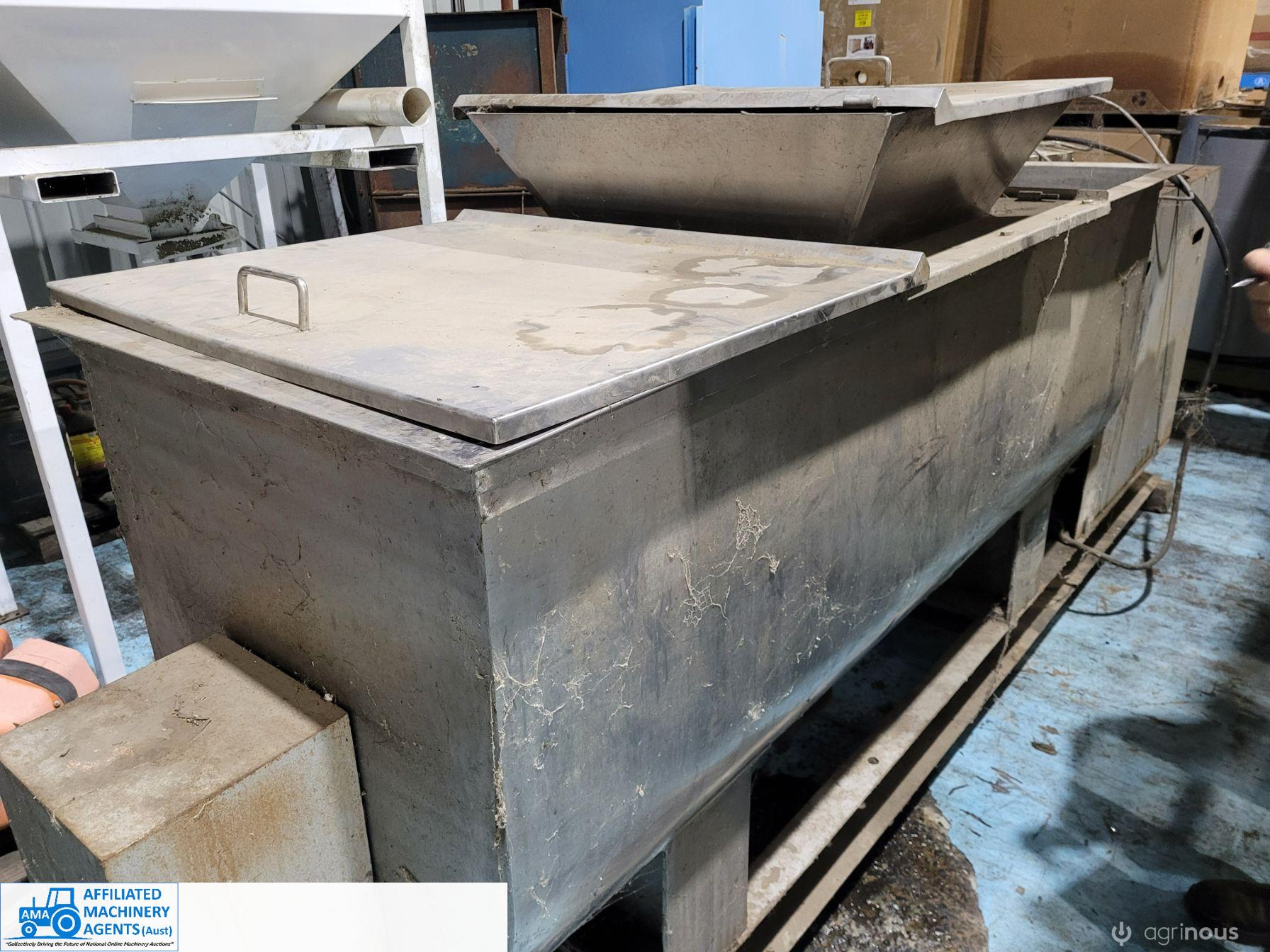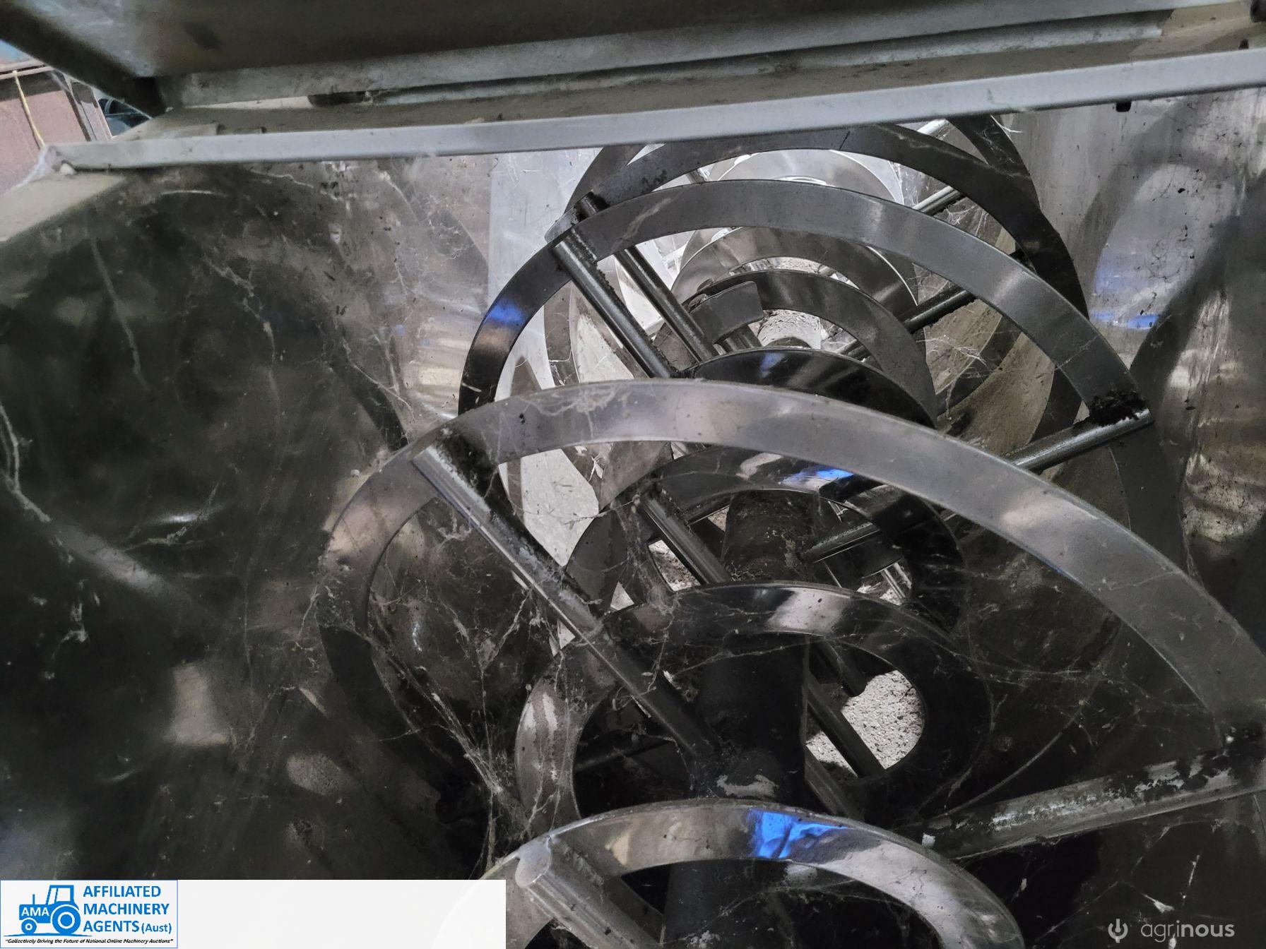 Stainless Steel Ribbon Blender, food grade, hardly used as-new working condition (purchased new for $28,000). Also includes solid steel stand to suit 4m x 2.2m with adjustable legs.