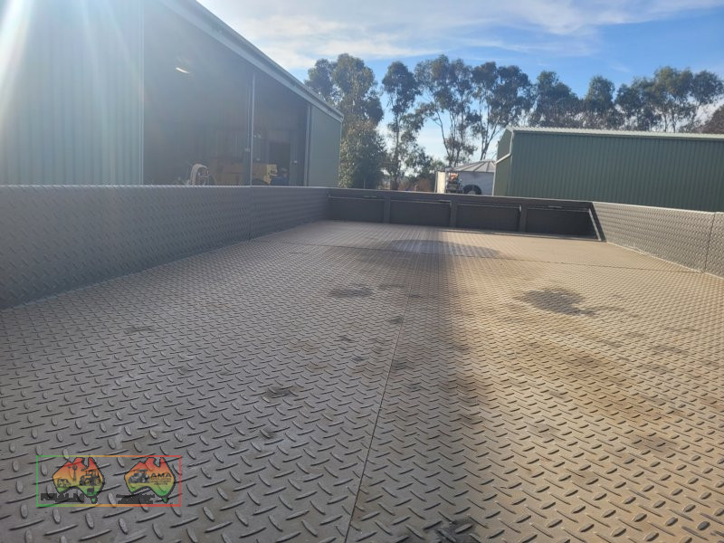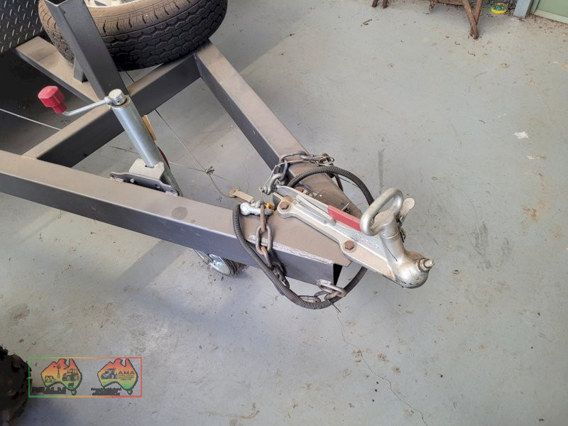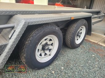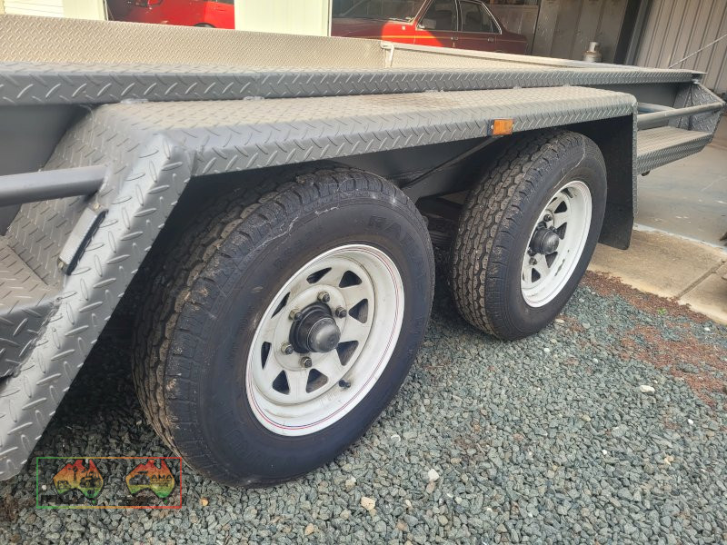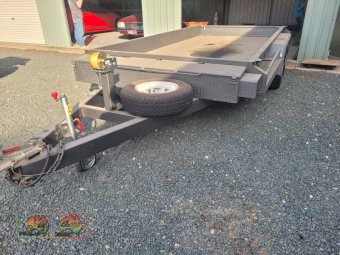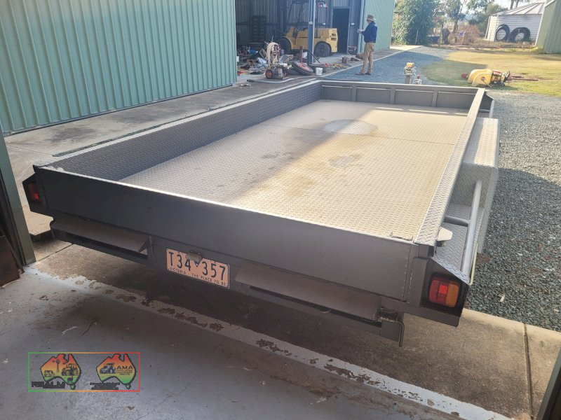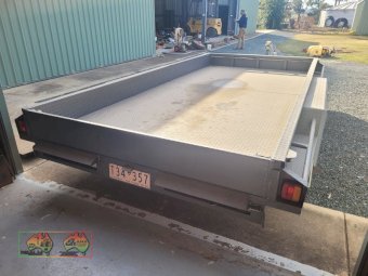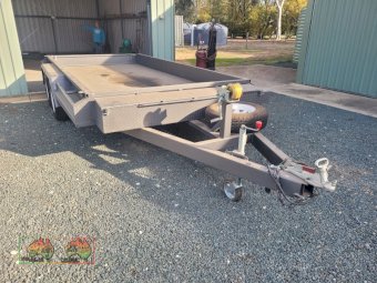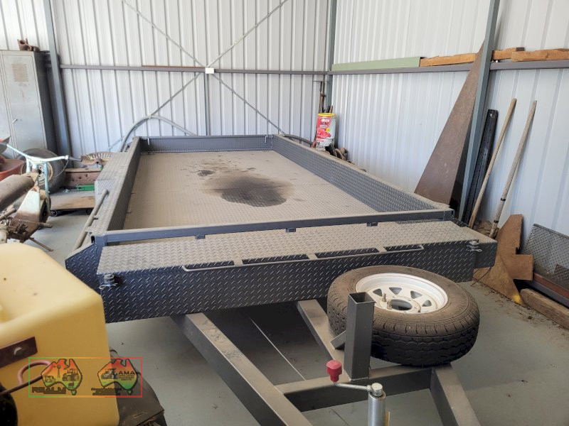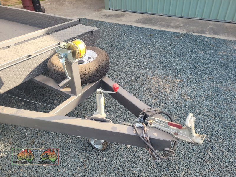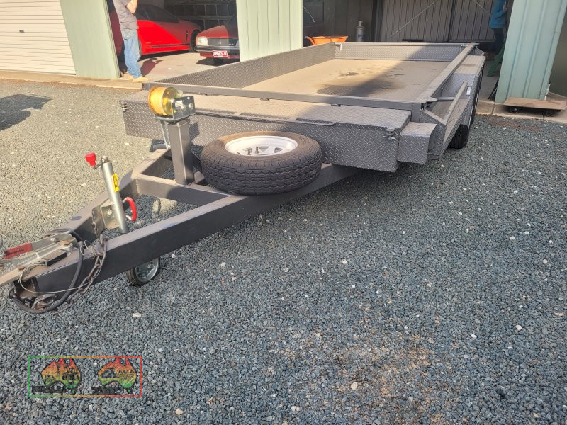 Tandem Car Trailer (14ft x 6'5" internal) ~ GTM=3.2 ton ~ Tare = 750kgs ~ Electric brakes ~ Underbody car ramps ~ Removable winch ~ Large front toolbox ~ Good checkerplate construction ~ Tie-down Hooks ~ Spare wheel & jockey ~ Designed & used for transporting Lanz-Bulldog Tractors ~ A very good quality trailer. ~ (NB: 5% Buyers Premium + GST will be added to sale price of all Lots sold) ~ Contact AMA Agent: Michael Downie 0458 241 242